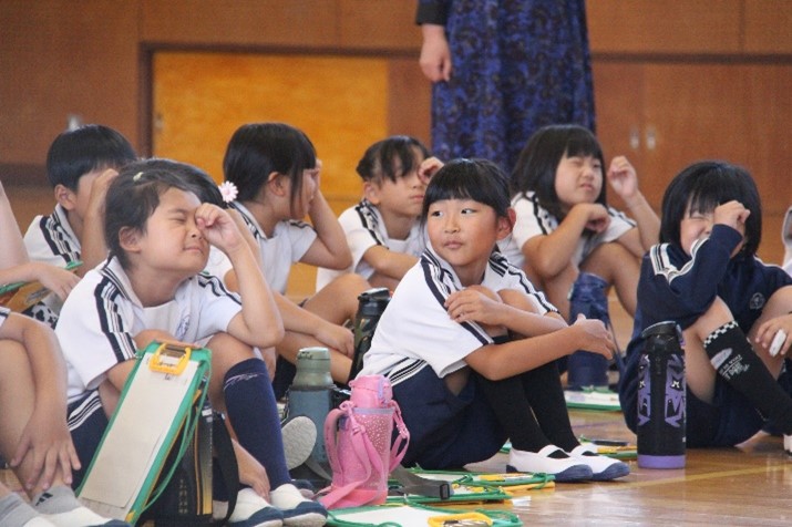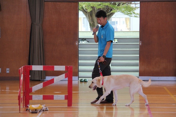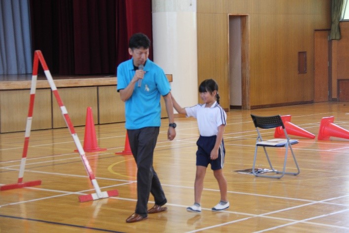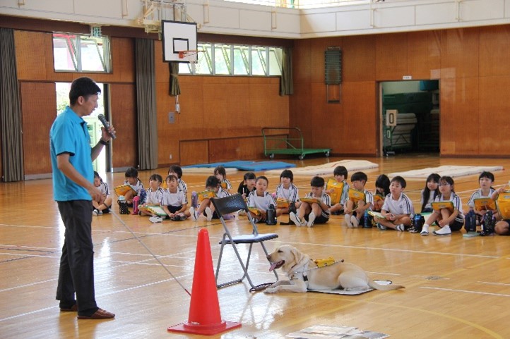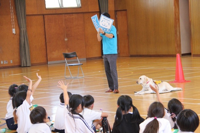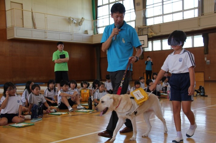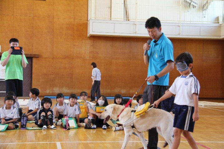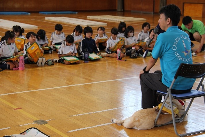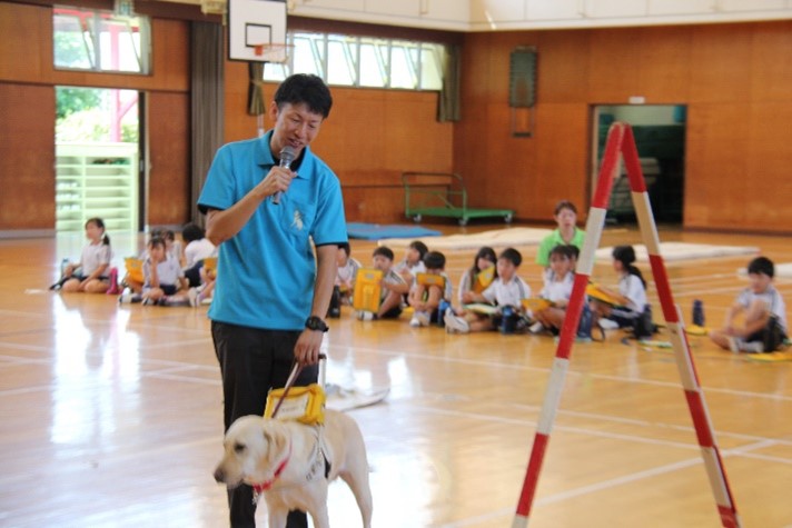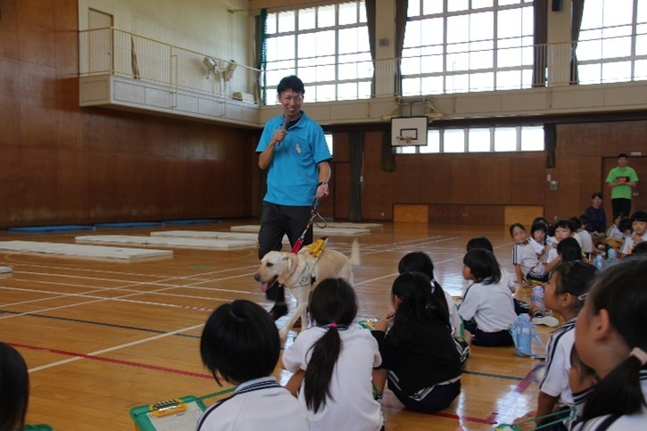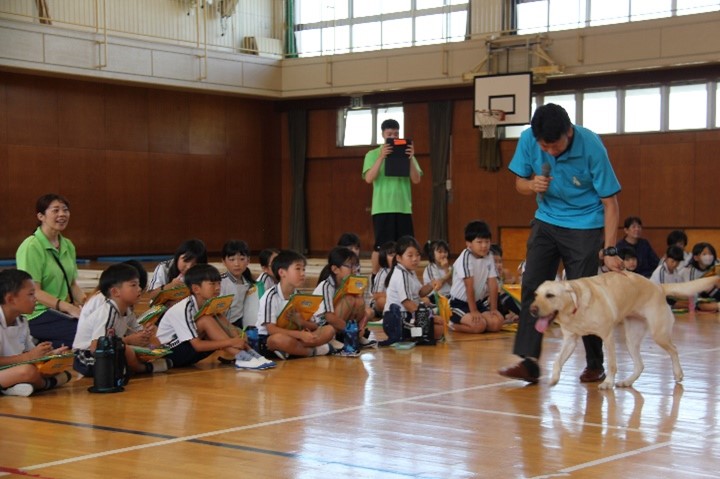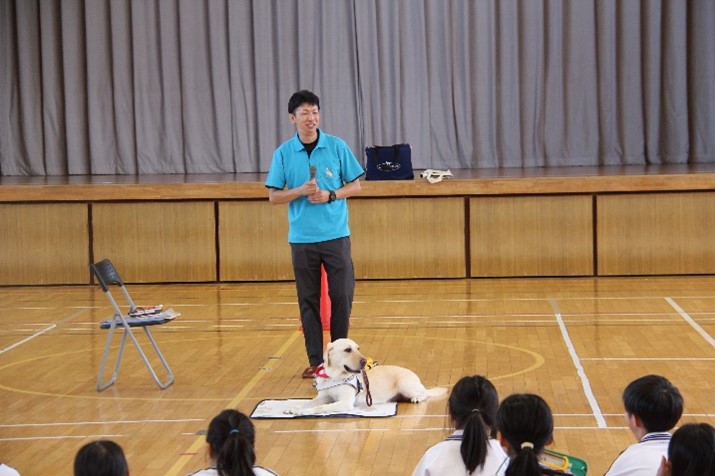 2025年9月22日 16時08分本日は、盲導犬協会の方にお越しいただき、2年生が福祉実践教室で盲導犬「トゥインクル」と視覚障害者について学びました。盲導犬の生い立ちや一生について話を聞いたり、訓練の説明やデモンストレーションを見たりしました。また、盲導犬「トゥインクル」と一緒に歩く体験もしました。最後に、協会の方から、町で見かけたときは、そっと見守ってほしいことや、困っていそうなときは「お手伝いしましょうか」と声を掛けてほしいことなどをお話していただきました。