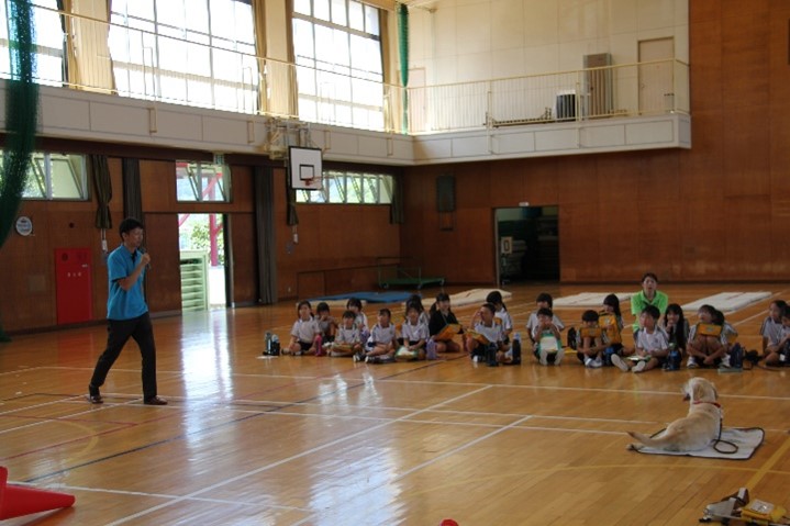 本日は、盲導犬協会の方にお越しいただき、2年生が福祉実践教室で盲導犬「トゥインクル」と視覚障害者について学びました。盲導犬の生い立ちや一生について話を聞いたり、訓練の説明やデモンストレーションを見たりしました。また、盲導犬「トゥインクル」と一緒に歩く体験もしました。最後に、協会の方から、町で見かけたときは、そっと見守ってほしいことや、困っていそうなときは「お手伝いしましょうか」と声を掛けてほしいことなどをお話していただきました。