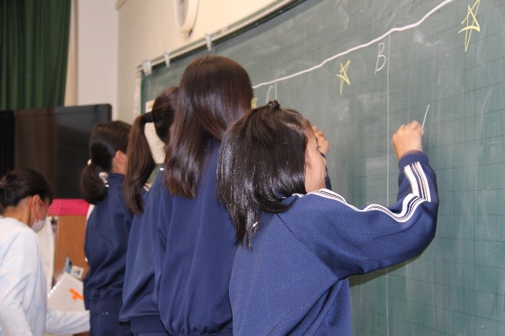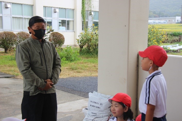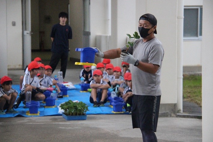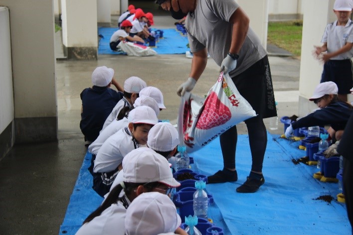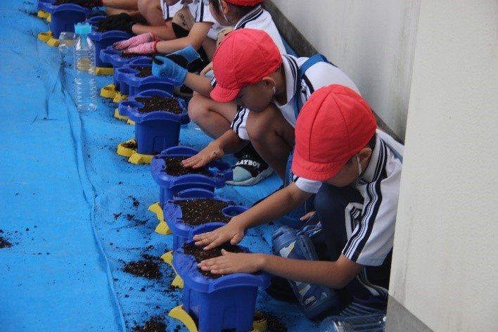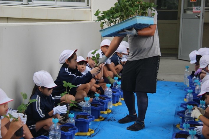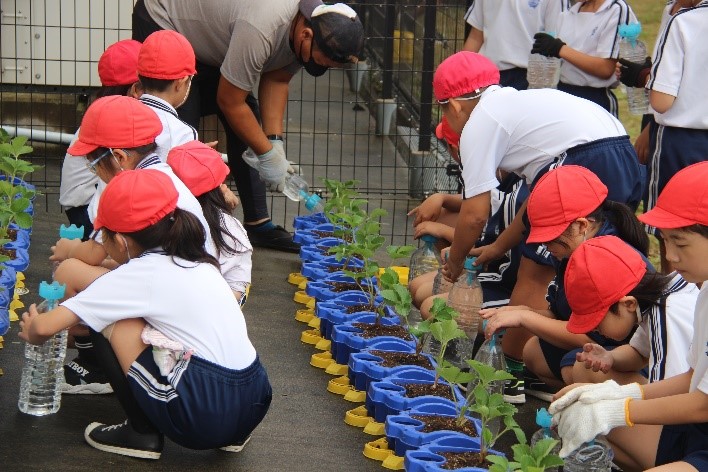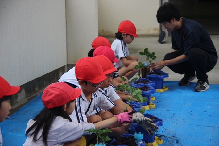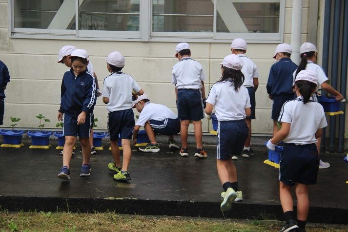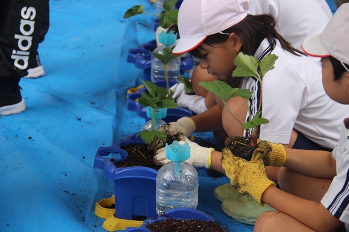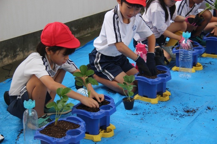 3年生のイチゴの苗の定植では、とぼねの時間を使い、地域講師の方に土や肥料の入れ方やイチゴの苗の植え方などをていねいに教えていただいて、一人一鉢に苗を植えました。へそ(ランナーの切り口)をどちらに向けて植えるとよいかなど、教わったことを意識して、ていねいに植えることができました。また、芋虫を取り除くことや、水やりを欠かさないことなどを教わりました。これから自分のイチゴに愛情を注ぎ、大きく育ててくれることと思います。