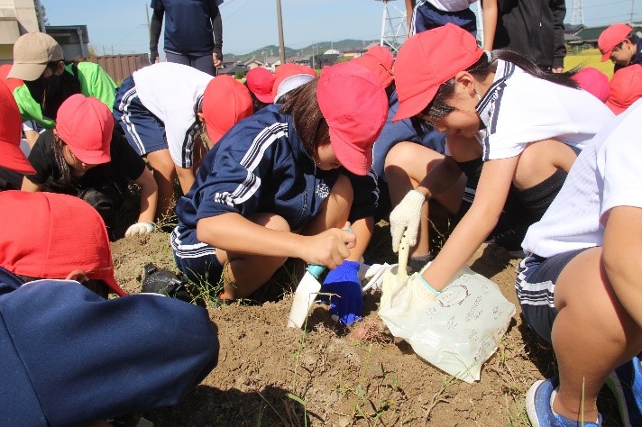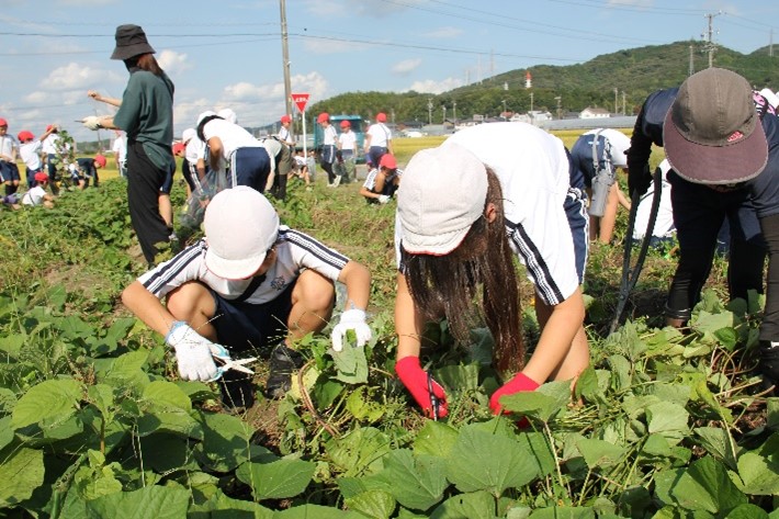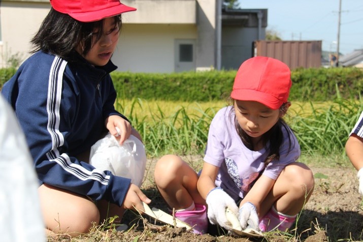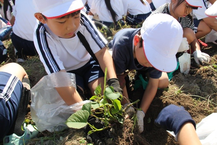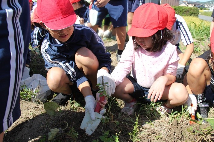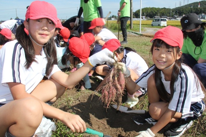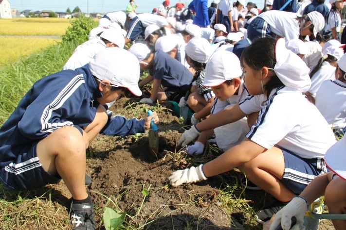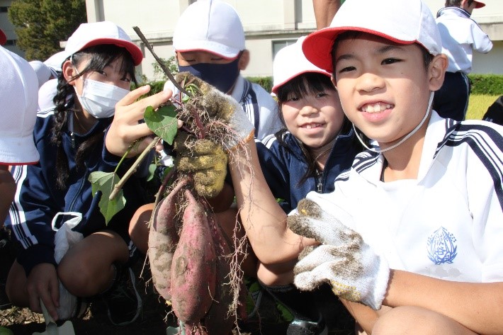 2025年10月2日 12時07分本日、サツマイモ掘りを全校で行いました。前日に4年生がつる切をしてくれたサツマイモ畑で、みどりのチームで協力して土を掘り返していくと、大小さまざまな芋が出てきて、サツマイモ畑は笑顔いっぱいになりました。今年は、夏の猛暑の影響もあり発育を心配しましたが、立派なサツマイモが収穫できました。取れたサツマイモは15日の収穫祭で、焼き芋にして食べる予定です。