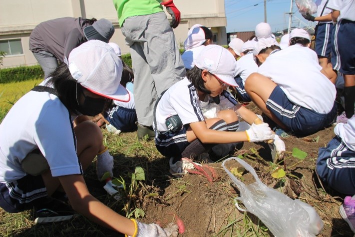 本日、サツマイモ掘りを全校で行いました。前日に4年生がつる切をしてくれたサツマイモ畑で、みどりのチームで協力して土を掘り返していくと、大小さまざまな芋が出てきて、サツマイモ畑は笑顔いっぱいになりました。今年は、夏の猛暑の影響もあり発育を心配しましたが、立派なサツマイモが収穫できました。取れたサツマイモは15日の収穫祭で、焼き芋にして食べる予定です。