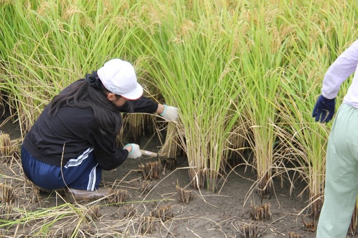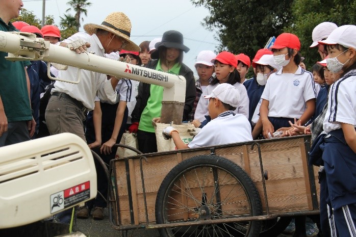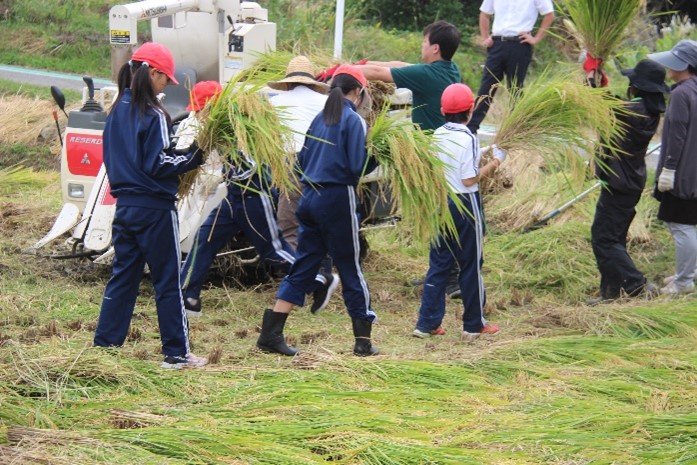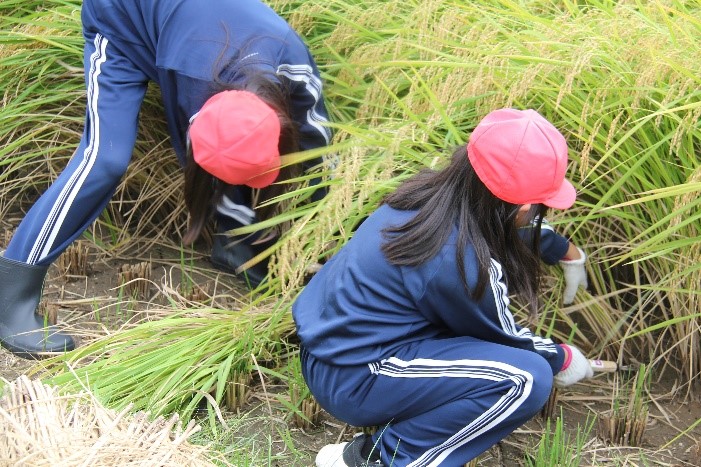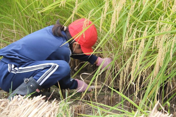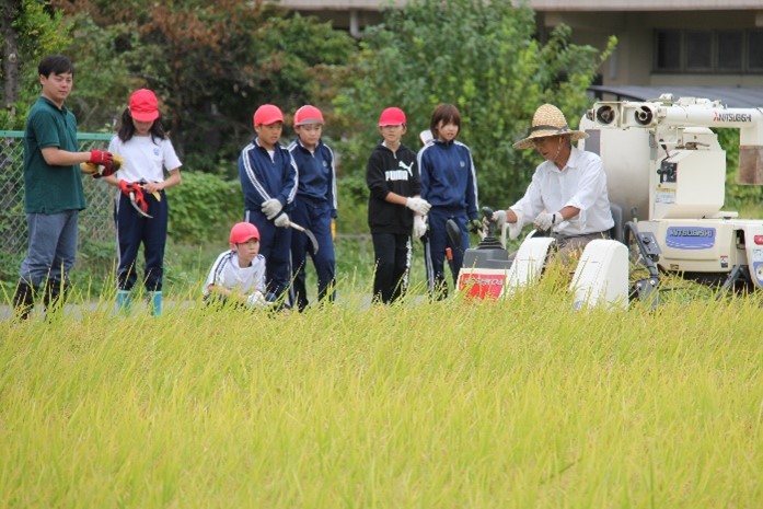 本日、5年生が稲刈りを行いました。米作りをとぼねの学習(総合的な学習)で行っており、5月に田植えをしてから、草取りをしながら育ててきました。地域講師の方のご指導を受けて、稲の刈り方を学びました。子どもたちは泥だらけになりながらも一生懸命に刈り取り、貴重な体験をすることができました。その後、講師の方がコンバインで刈り取ってくださり、今年もたくさんの米を収穫することができました。