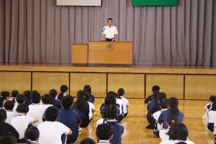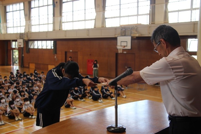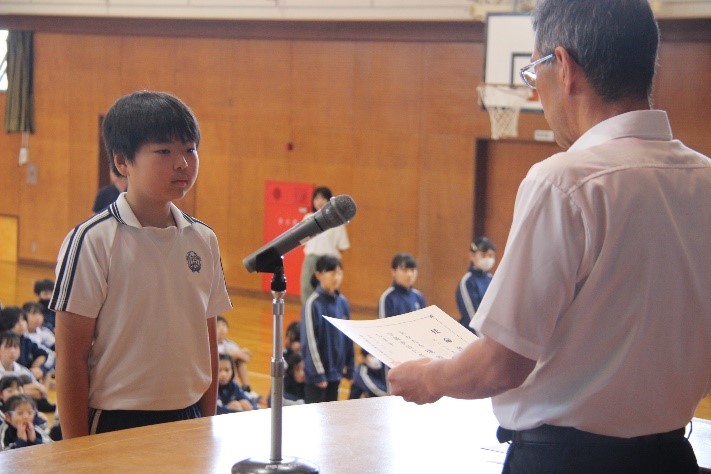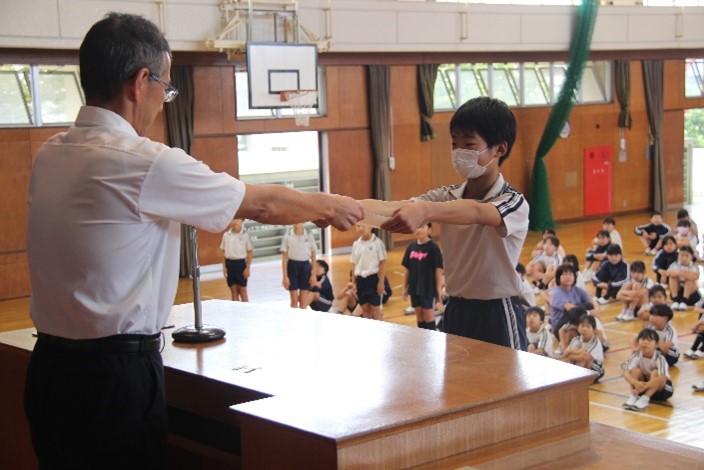 朝会では、後期の学級委員及び委員会の委員長、副委員長の任命式と読書感想文コンクールの表彰がありました。任命された子たちは、とても大きな声で返事をすることができました。学級、委員会のリーダーを中心に全校一丸となり、後期の荻谷小学校を盛り上げていってほしいです。また、校長先生からは、「委員会ごとにアイデアを出し合って、より充実した活動を行ってほしい」ことや「1学期に決めた級訓を振り返り、級訓に込めた思いが達成できるように頑張ってほしい」ことについてお話がありました。
