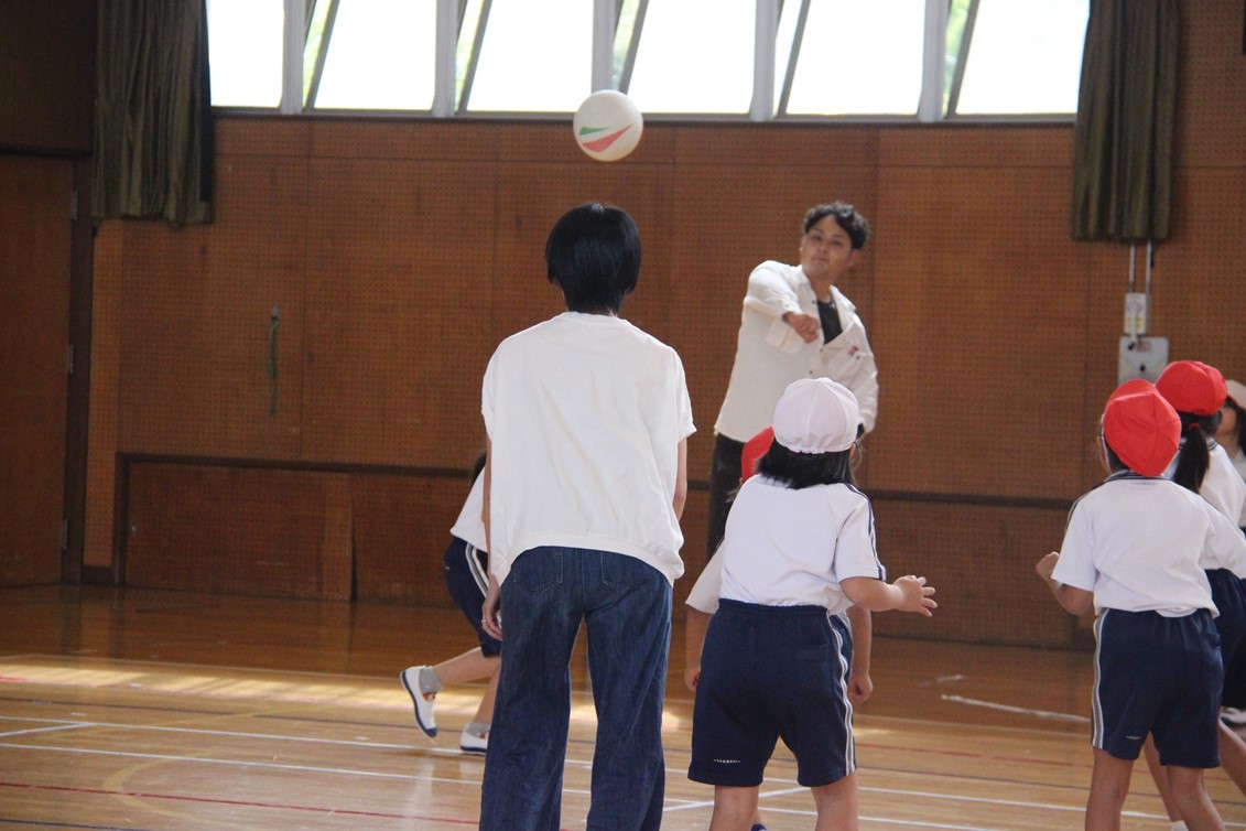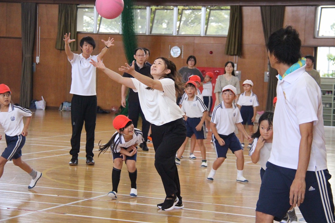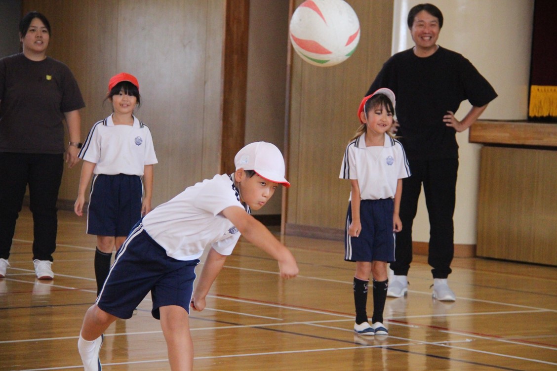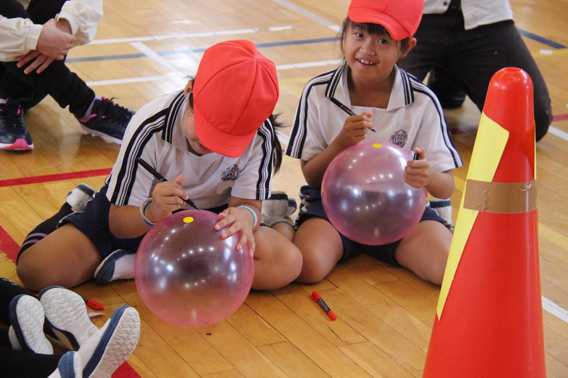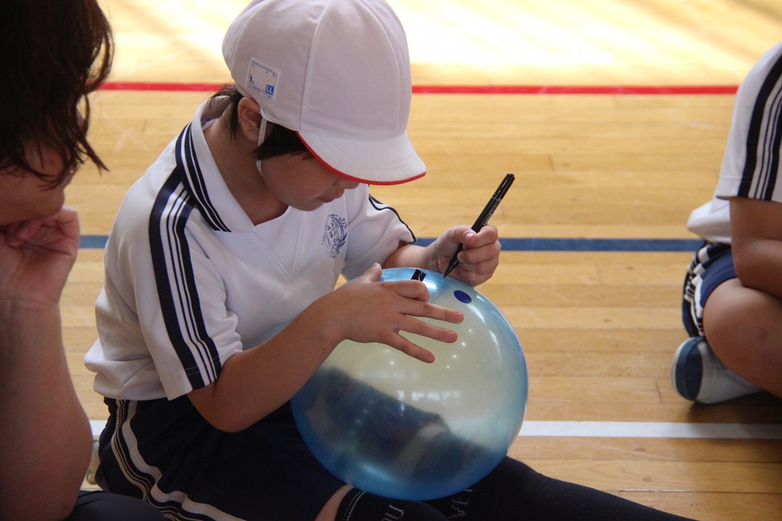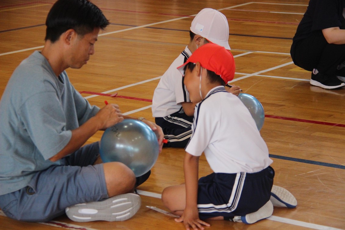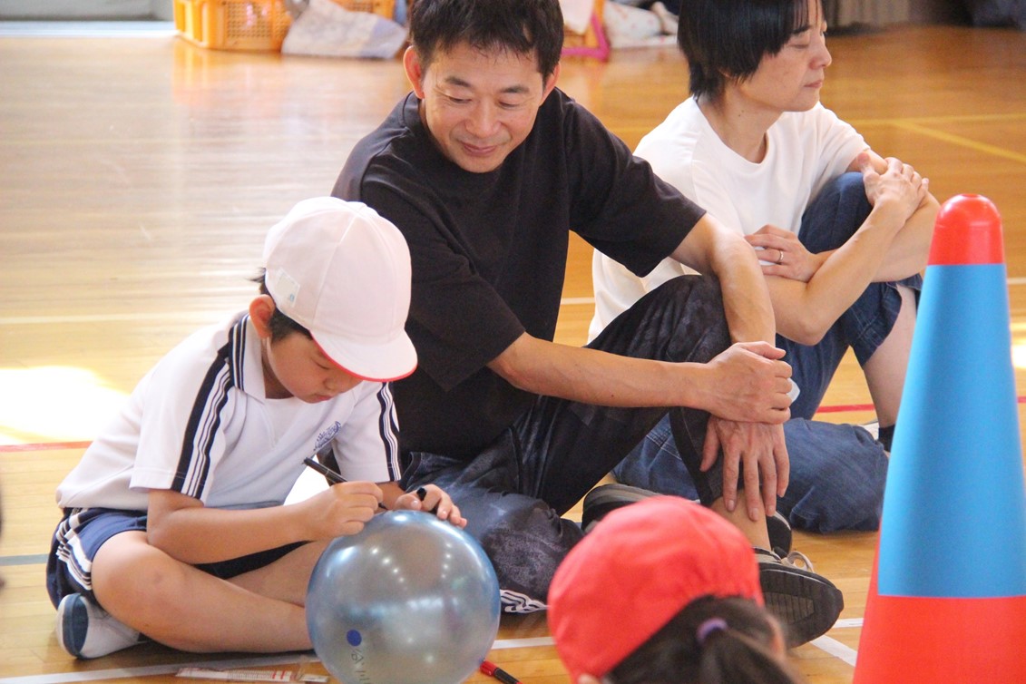 親子活動では、一人ひとり用意されたカラーボールに、親子で名前を書いたり絵を描いたりしてマイボールを作りました。その後、4チームに分かれて親子混合でチームを作り、みんなでドッジボールに親しみました。大人が捕ったボールを子どもが投げたり、ナイスプレーに歓声が上がったりと、みんなで和気あいあいと楽しみながら汗を流しました。