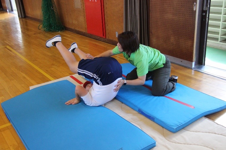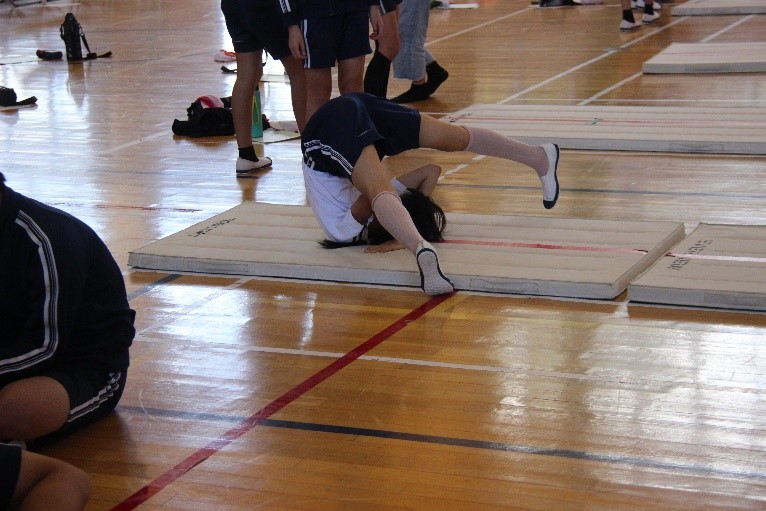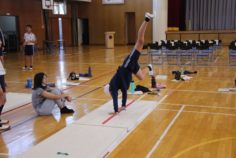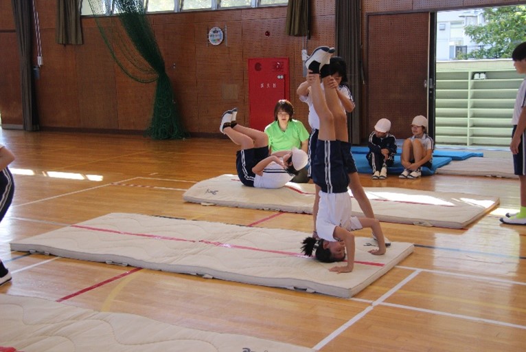 6年東組は、体育の「マット運動」の授業を行いました。「いろいろな技にチャレンジしよう」という課題のもと、開脚後転やとび前転、側方倒立回転などの技に、膝を伸ばすことや脚をそろえることを意識しながら取り組みました。