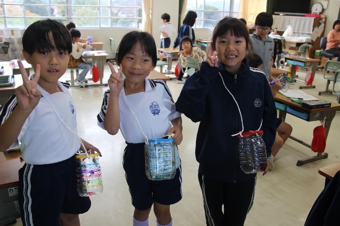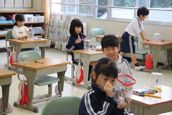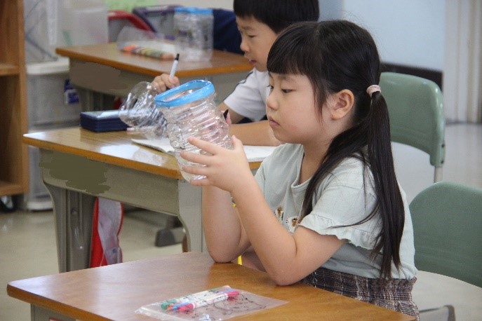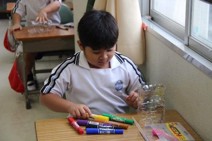 1年東組は、生活科の「あきとなかよし」の授業を行いました。秋の実拾いでバッグとして使うペットボトルに絵を描きました。子どもたちは、秋をイメージしながら、思い思いに絵を描きました。マイペットボトルバッグをもって秋の実拾いに出かける日が楽しみになりました。