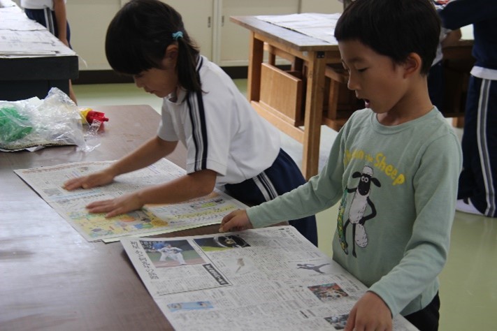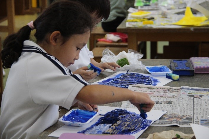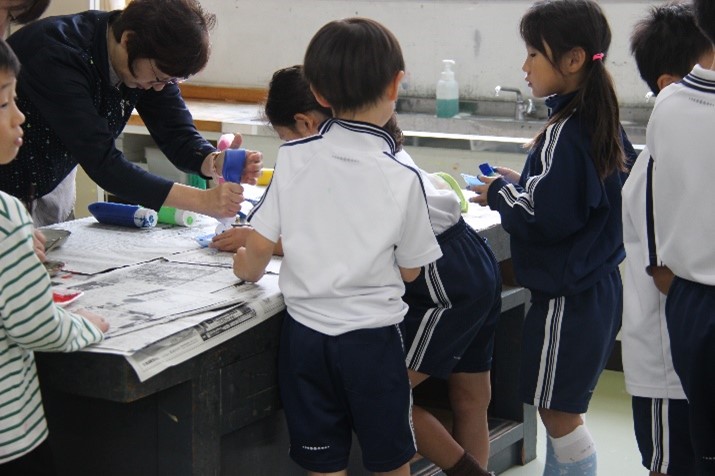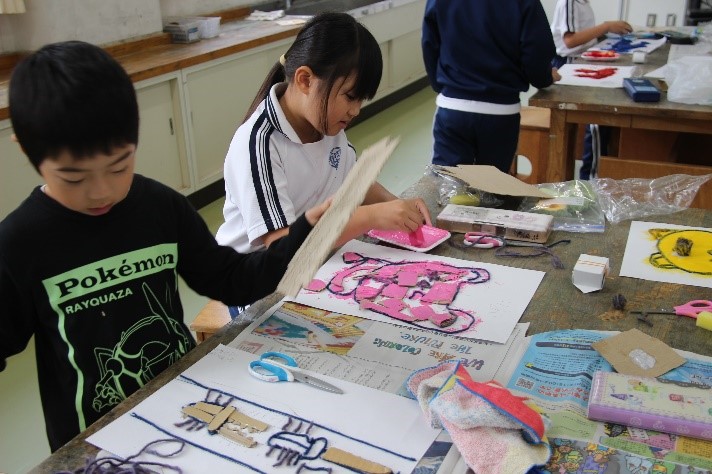 1年西組は、図工の授業で「生きものをはんがとスタンプであらわそう」の学習を行いました。自分の好きな生き物を毛糸やダンボーを使って形をつくり、それに色をつけたり、作ったスタンプを押したりして、楽しみながら作業しました。