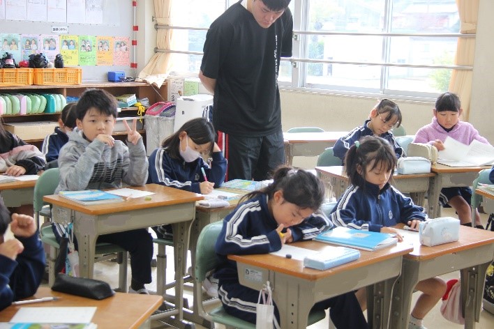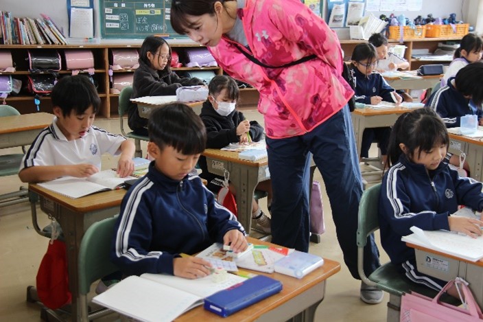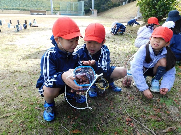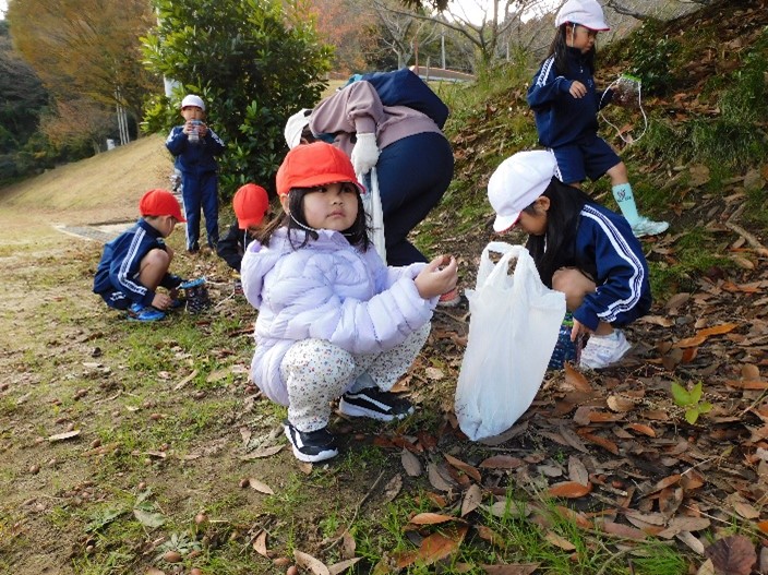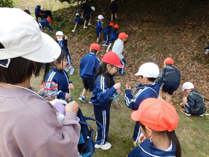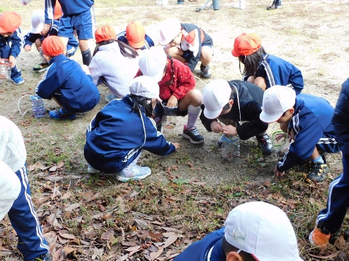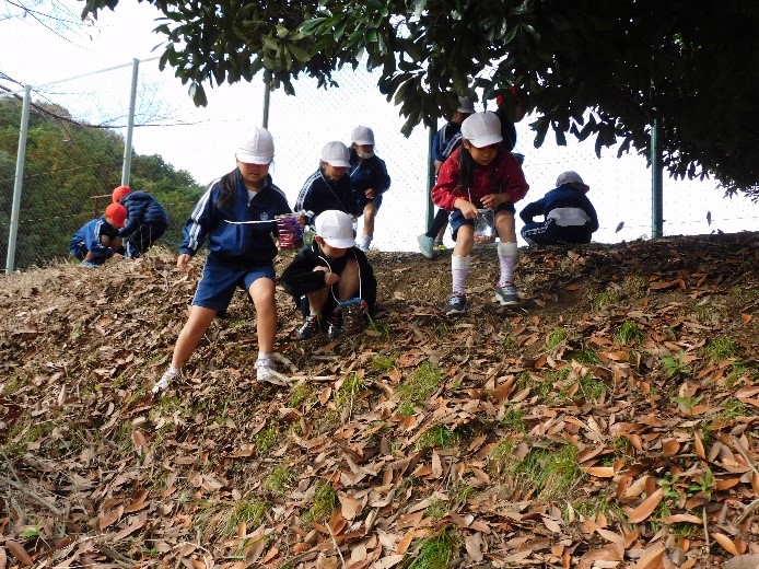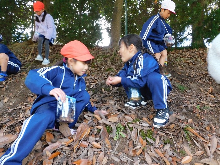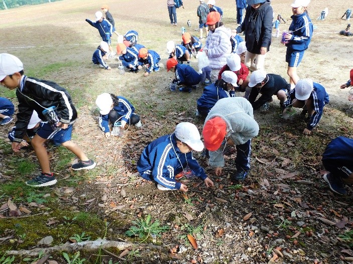 1年生は、生活科の授業で「あきとなかよし」の学習を行い、とぼねグランドに秋を探しに出かけました。自分たちが作ったペットボトルバックに見つけた秋を入れました。見つけるたびに笑顔になる子どもたちの姿に微笑ましさを感じました。