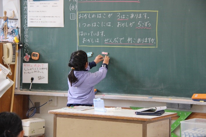 2年東組は、算数の授業で「かけ算」の学習を行いました。「かけられる数とかける数について考えよう」という学習課題のもと、問題文の内容に合わせて、どういう式になるのか考えました。そこから、1つ分の数のいくつ分かを考えると、かけ算の式がつくりやすいことを学びました。
