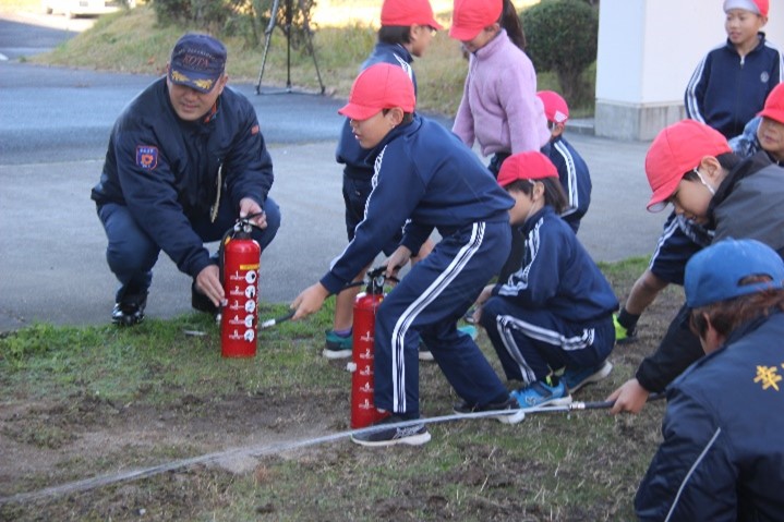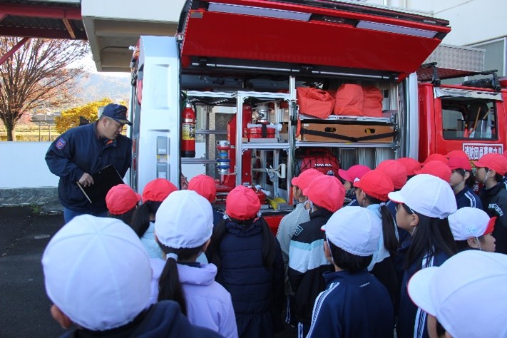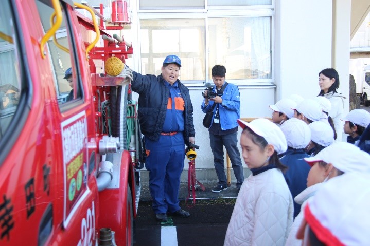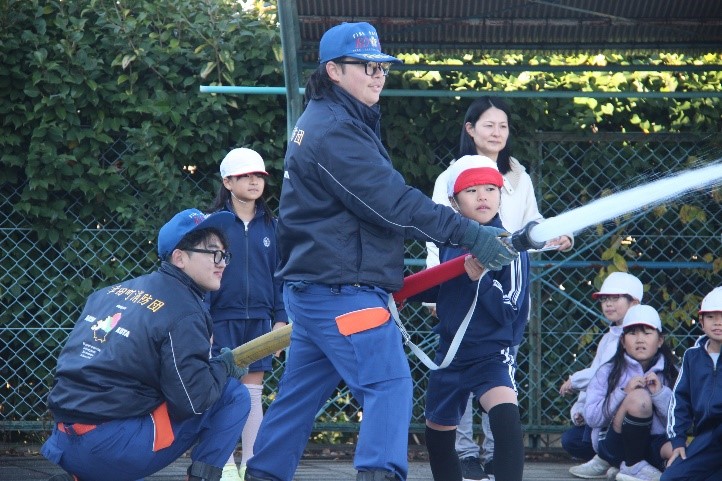 3年生の消防団体験教室では、団員の方から消防団の役割についての説明を聞いたり、消防車や機材の見学をしたりしました。また、放水体験や水消火器体験もしました。説明を聞いたり、見学したり、体験したりする中で、消防団の方たちがみんなの安心・安全な生活のために、どのような工夫や努力をしているのかを学びました。