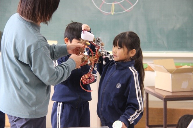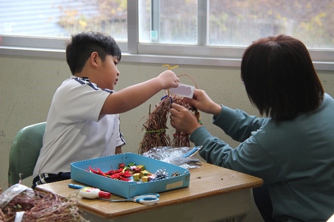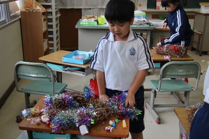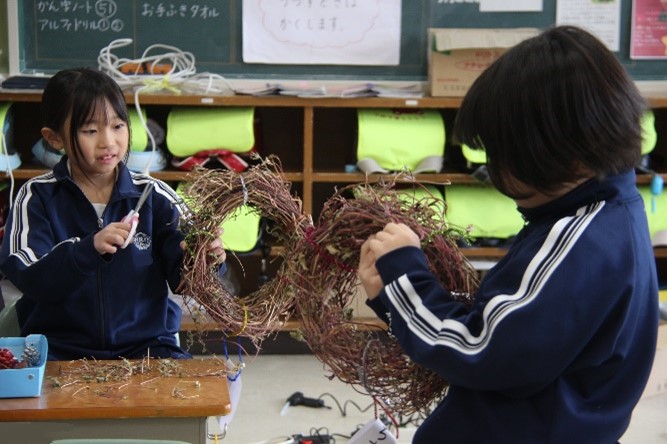 1年東組は、生活科の「あきとともだち」の学習を行いました。朝顔のつるで作ったリースに飾り付けを行い、自分だけのオリジナルリースを作りました。リースができ上がると、みんなで見せ合いながら、自分だけのリースに満足そうな笑みを浮かべていました。