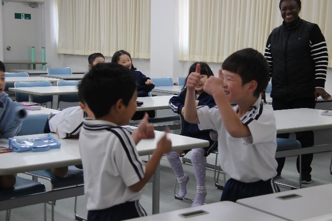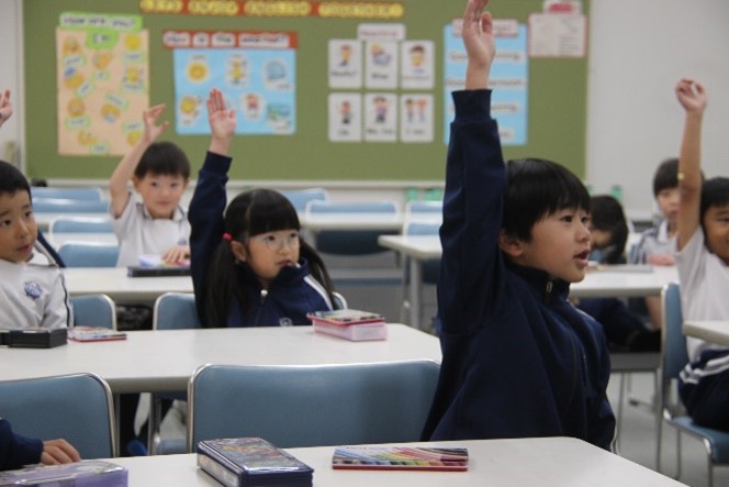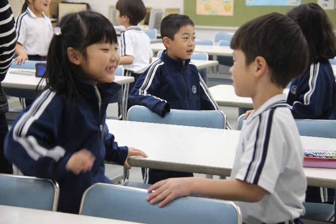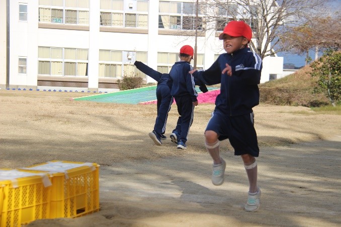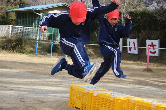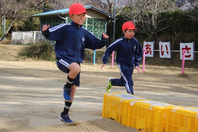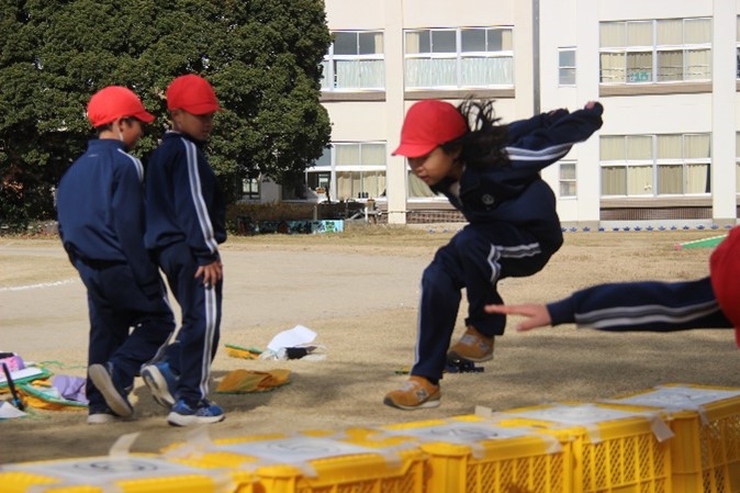 2年東組は、体育の授業で「はばとびあそび」の学習を行いました。「遠くにとんで、とく点をゲットしよう」の課題のもと、高い得点をとるためにはどうしたらいいかを考えて跳ぶ練習をしてきました。本時はその成果を確かめる授業でした。子どもたちは、自分の記録が伸びて「やった!」と喜んでいました。
