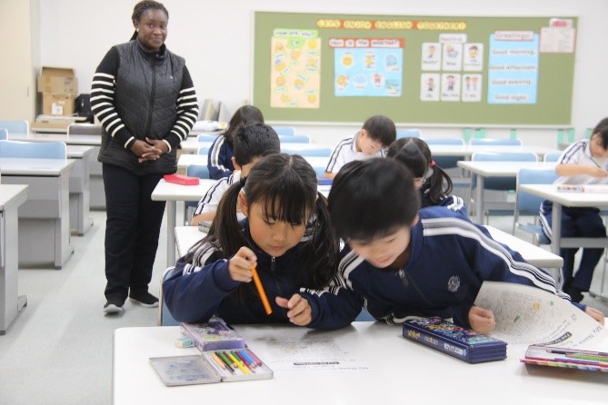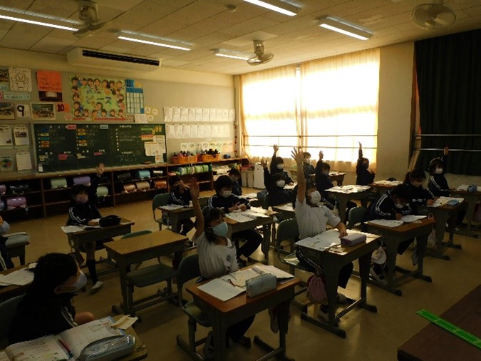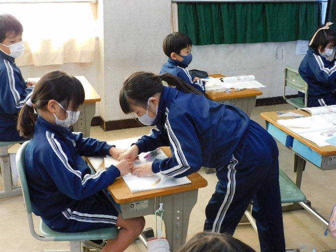 1年西組は、英語の学習を行いました。野菜に関する英単語をALTと一緒に発音しながら練習しました。そして、好きな野菜について友達や先生と英語で会話したり、ぬり絵で野菜探しをしたりして楽しみました。