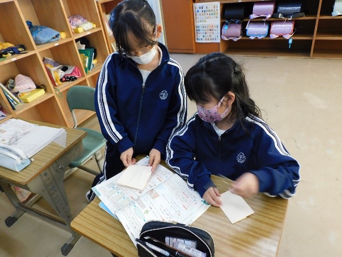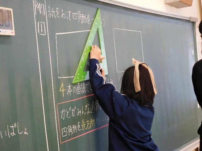 2年西組は、算数の「三角形と四角形」の授業を行いました。「作った四角形のかどの形や辺の長さについてしらべよう」という学習課題のもと、三角定規を使って調べました。そこから、角が全て直角になっている四角形を長方形ということを学びました。