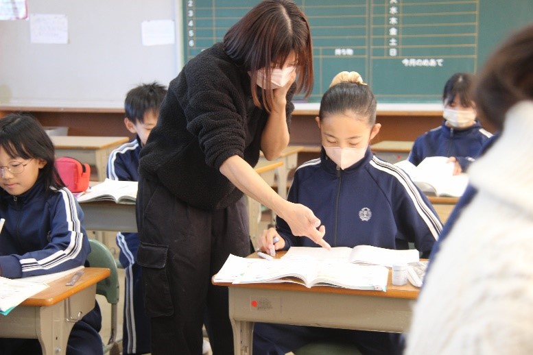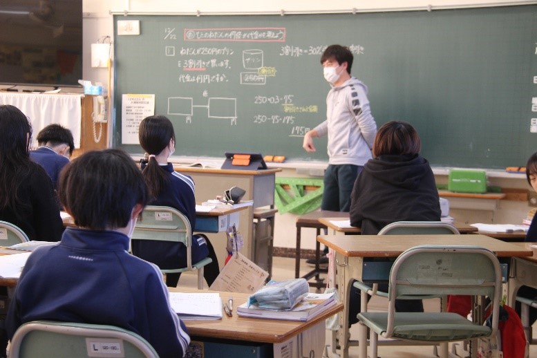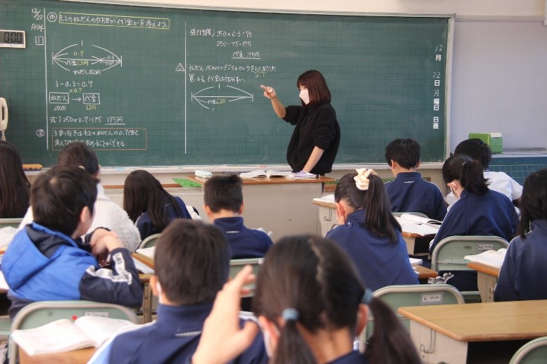 5年生は、算数の「割合」の授業を行いました。「もとのねだんの何倍が代金かを考えよう」の学習課題のもと、割引きされた商品の値段がいくらになるかを求める問題に取り組みました。そこから、全体の何割が値引きされた値段になるかを考えるといいことを学びました。