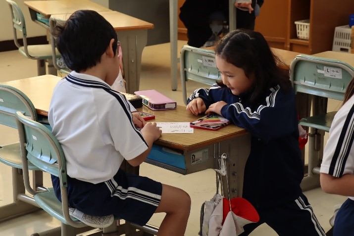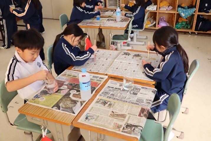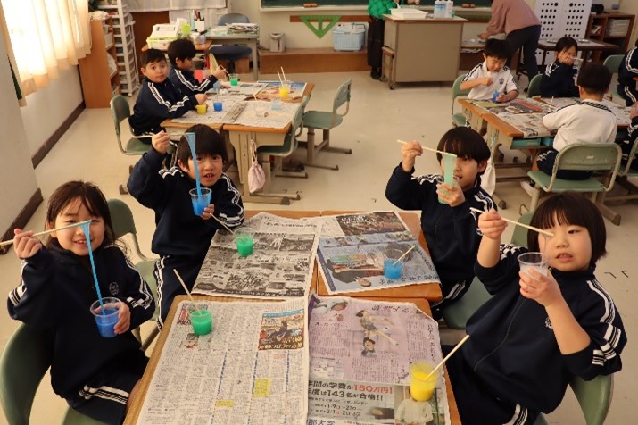 1年東組は、学活の授業で「新年会(お楽しみ会)」を行いました。教師の説明の後、「スライムづくり」を行いました。自分だけのスライムを完成させ、出来上がったスライムで楽しそうに遊びました。
