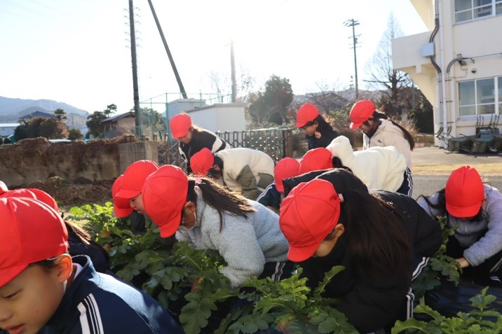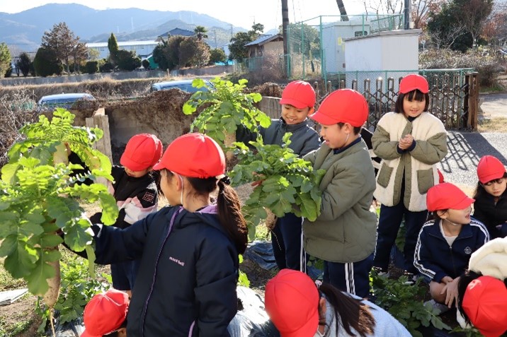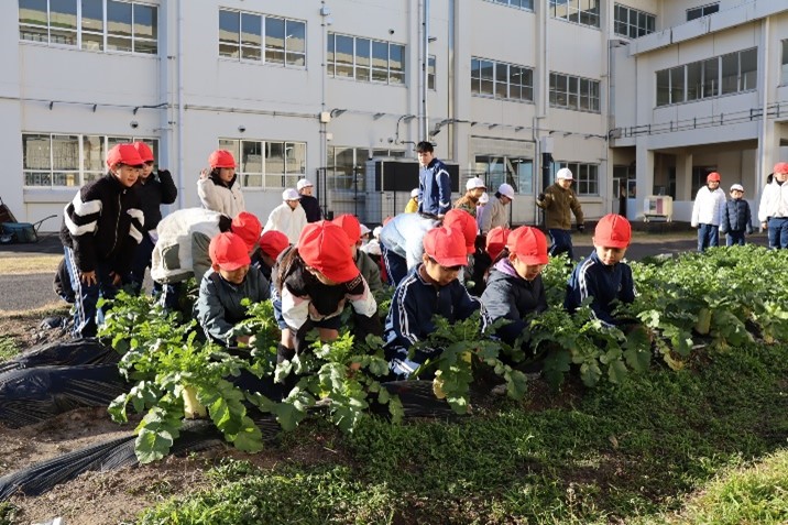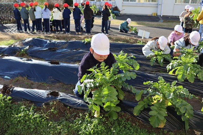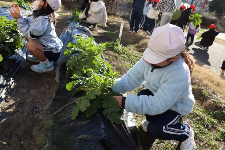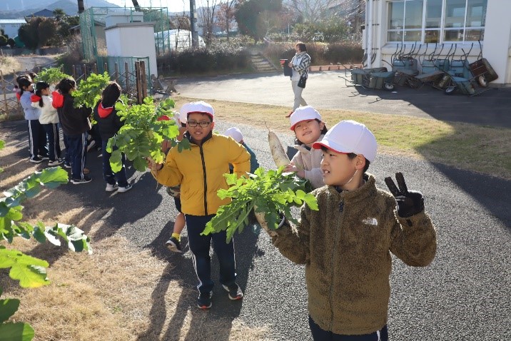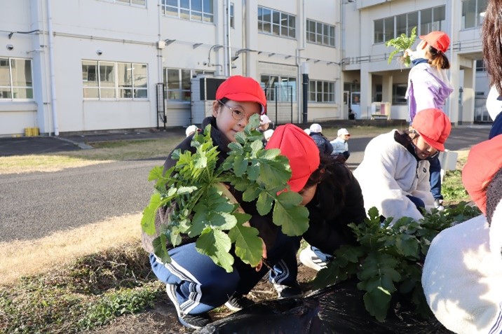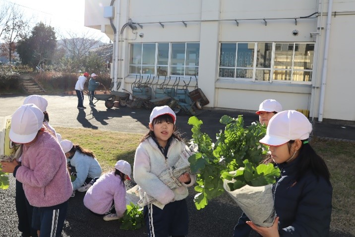 2年生は、生活科の授業で「冬やさいをそだてよう」の学習を行いました。2学期に植えた大根を水やりをしながら大事に育ててきました。今日はその大根を収穫しました。大きく立派に育った大根を抜いて、子どもたちはとてもうれしそうでした。