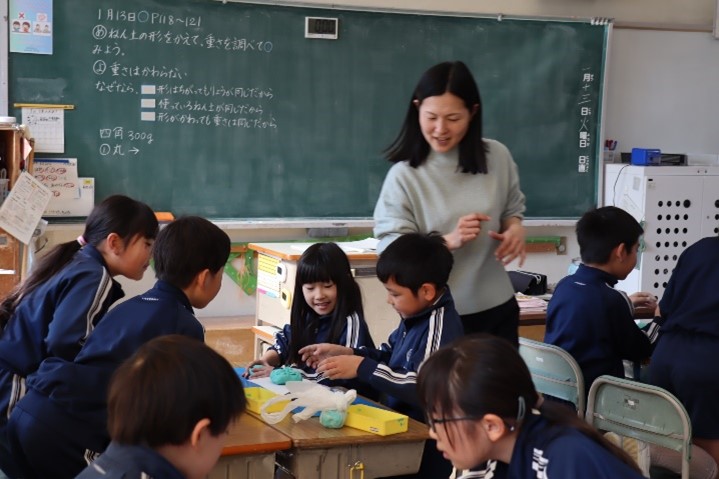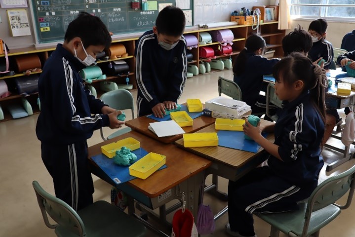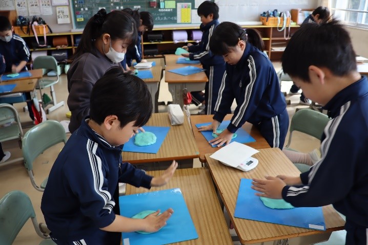 3年東組は、理科の授業で「物の重さ」の学習を行いました。同じ重さの粘土を用意し、四角や平ら、丸などの形をつくり、重さをはかりました。そこから、形が変わっても重さは変わらないことを学びました。
