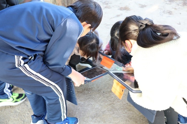 4年西組は、理科の授業で「あたたかさと生き物(冬)」の学習を行いました。校庭に出て、生き物(動物)を探しました。落ち葉の下のダンゴムシや池のメダカの様子を写真に撮り、観察カードにまとめました。
