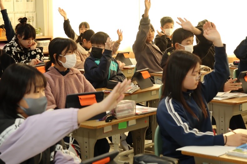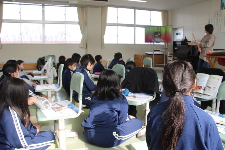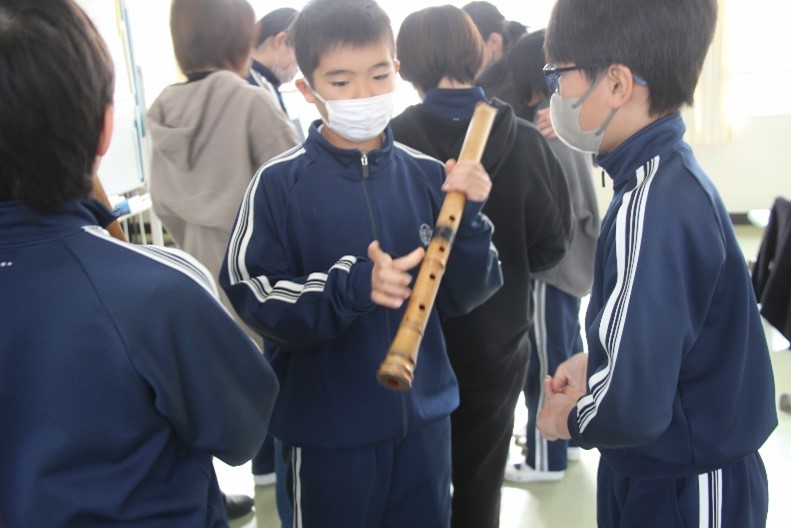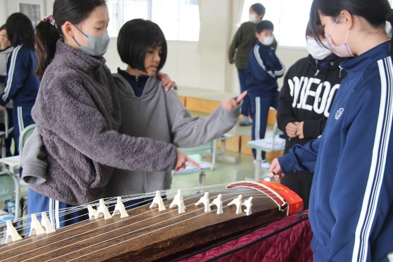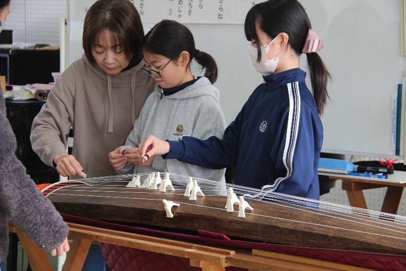 5年東組は、音楽で「春の海」の授業を行いました。日本の楽器である琴や尺八での演奏を鑑賞し、その後で楽器に触れました。その後、親指に角づめをはめて、実際に琴の音を出す体験をしました。