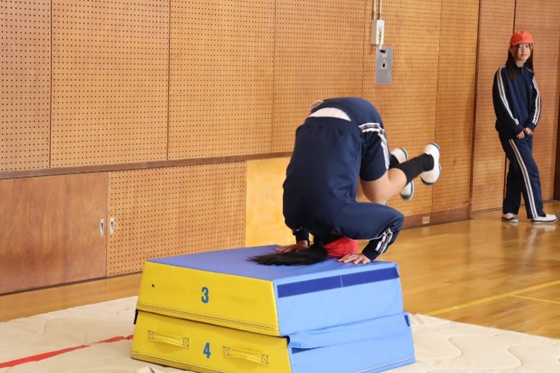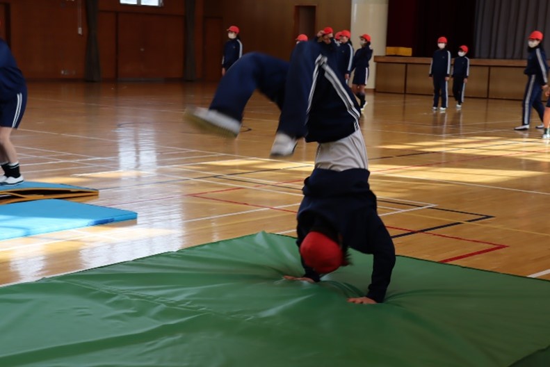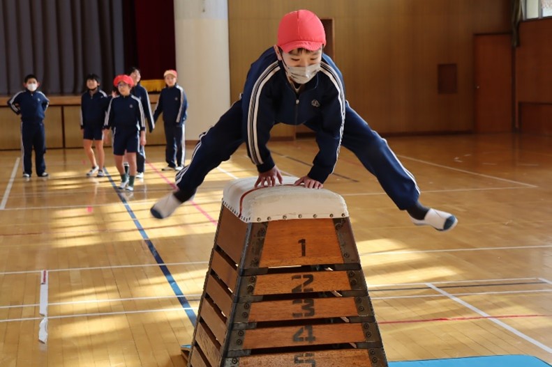 6年西組は、体育の授業で「とびばこ運動」の学習を行いました。「レッツ・トライ!めざせ!とびばこマスター」の課題のもと、開脚跳びや台上前転、前方屈腕回転跳びなどの技に、助走スピードや両足ふみ切り、腰の高さや手を着く位置などを意識しながら取り組みました。練習を積み重ねる中で、できなかった技ができるようになり、子どもたちはとても喜んでいました。
