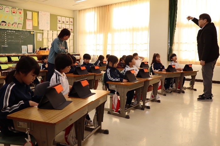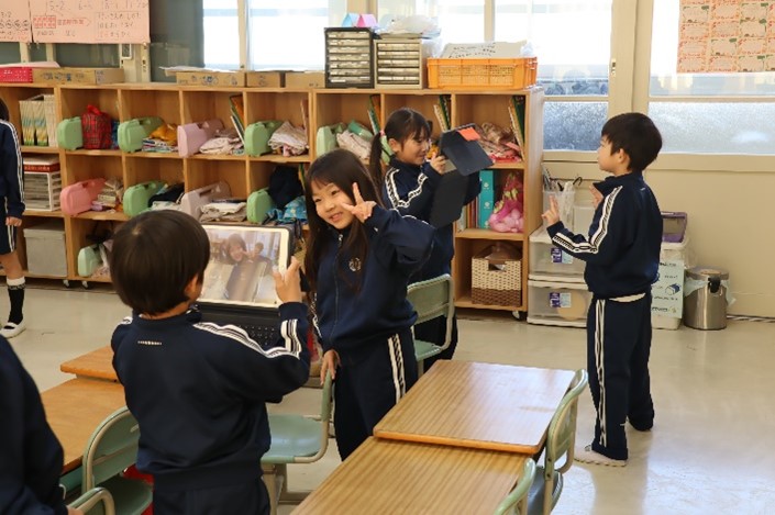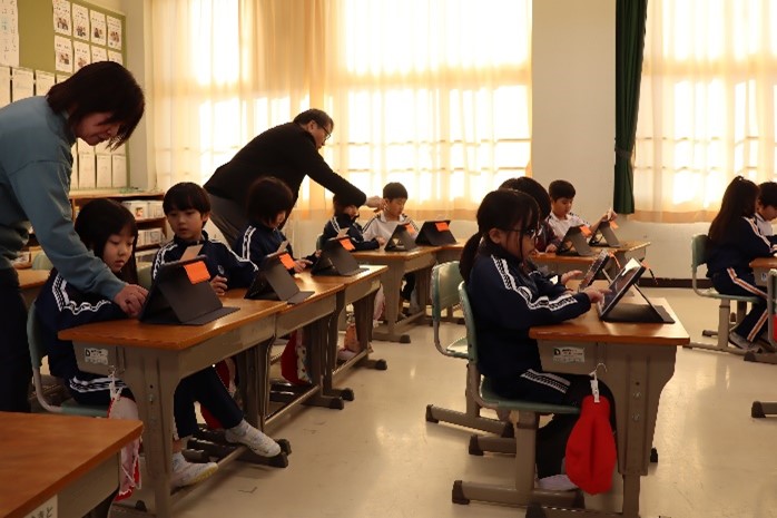 1年東組は、学活の授業で「1年のまとめをしよう」の学習を行いました。タブレットを使って、この1年の自分の学びをコラボノートでまとめられるように、支援員さんにコラボノートの使い方を教えてもらいました。教えてもらったことをもとに、コラボノートで自分の1年をどう表現するのか楽しみです。