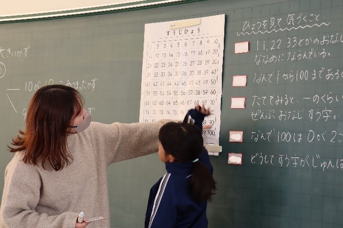 1年西組は、算数の授業で「大きいかず」の学習を行いました。1から100までの数を表にまとめました。そして、表を見て気が付いたことをみんなで話し合った後、1から100までの数の表には、いろいろなきまりがあることを学びました。