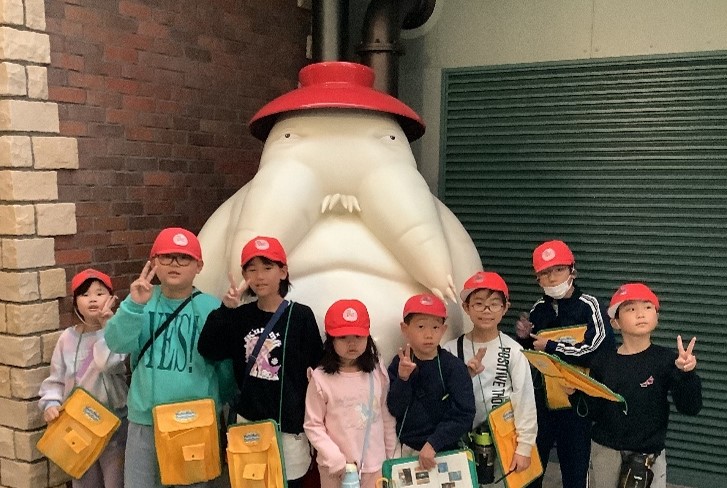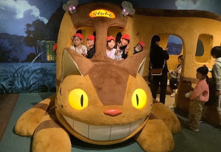 あしの芽の校外学習はジブリパークに行きました。あしの芽学級は、この1年を通して、ジブリに触れる機会をたくさん設けてきました。パーク内には、映像で見たことがあるネコバスやロボット兵などが展示してあり、子どもたちは目を輝かせて見て回りました。展示物には、実際に触ることができるものもあり、実際の大きさに驚いたり、キャラクターの真似をしたりして楽しんでいました。どの子も「また行きたい。」と話していて、楽しい校外学習になったようです。