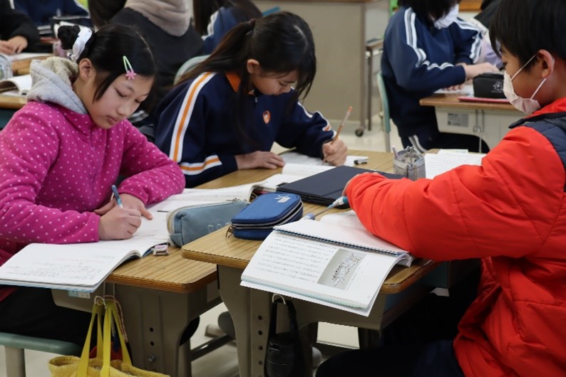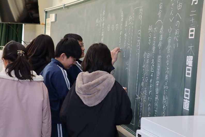 6年東組は、国語で「宇宙への思い」の授業を行いました。宇宙に関わる人が書いた文章から、どんなことに取り組み、何を思っているのかを考えます。今日は宇宙食の開発に携わる筆者の考えや願いをグループで読み取り、まとめました。