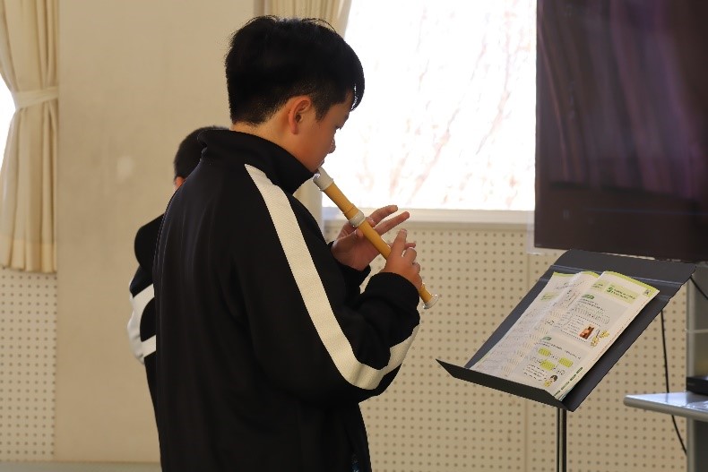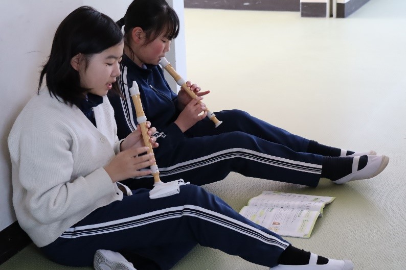 6年西組は、音楽でリコーダーのテストと「雅楽」の授業を行いました。練習してきた「メヌエット」のリコーダーテストの後、日本に古くから伝わる音楽「越天楽今様」を聴きました。その後、この曲の元となる雅楽「越天楽」を鑑賞しました。