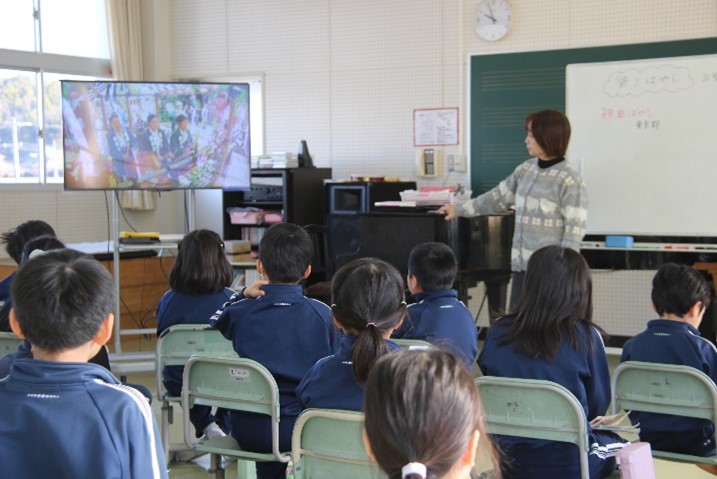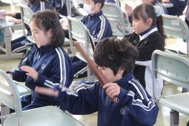 3年東組は、音楽の授業で「地域に伝わる音楽でつながろう」の学習を行いました。お祭りを盛り上げる音楽「祭り囃子」の中から「神田囃子」について学びました。DVDを観た後、使われている楽器について学習し、イスを使って、しめ太鼓のリズムを口唱歌で歌いながら叩いてみました。
