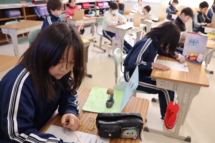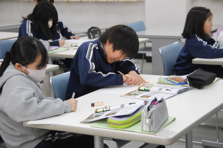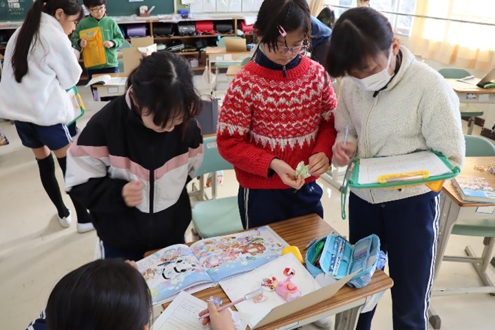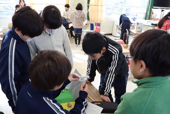 4年東組は、図工の授業で「本を開くとお気に入りの場面」の学習を行いました。完成した自分の作品について振り返った後、友だちの作品を鑑賞し、交流し合いながら自分の作品との違いや友だちの作品の良いところについて考えました。