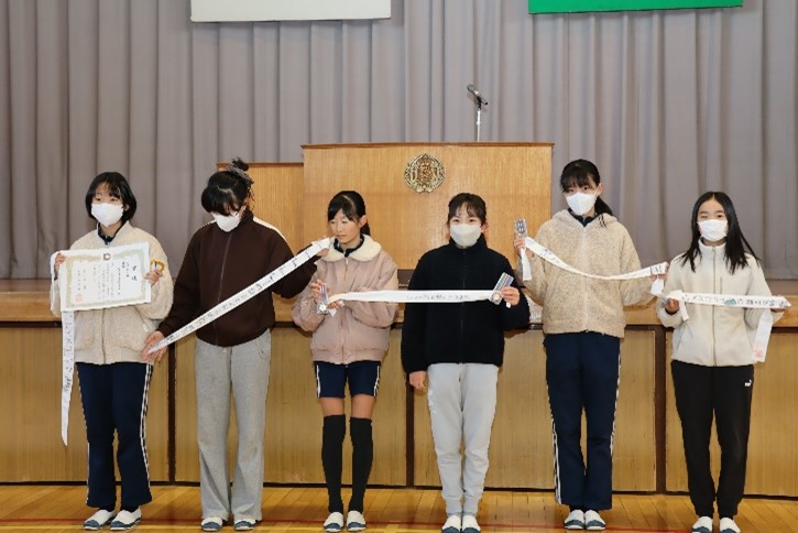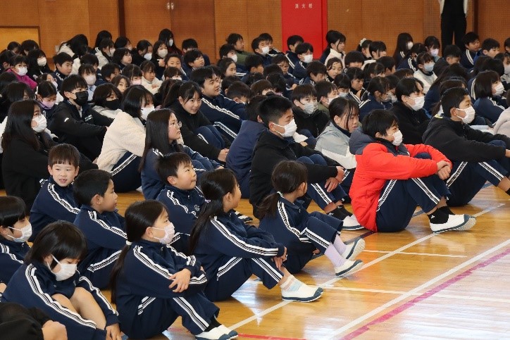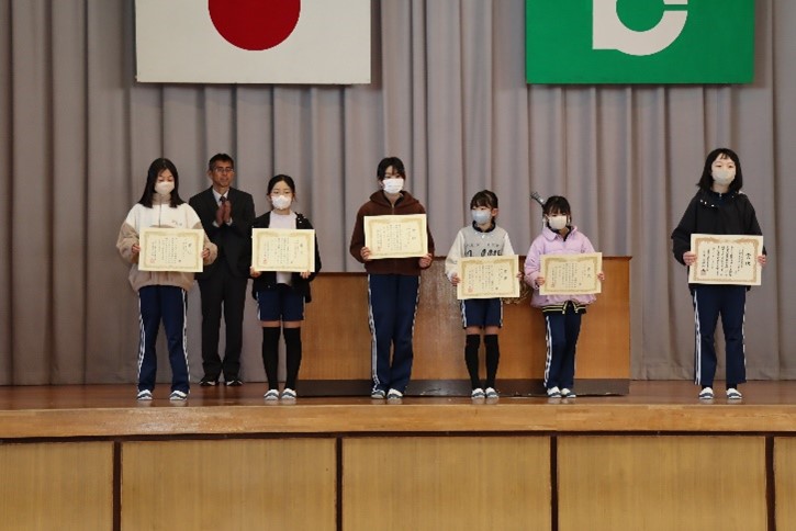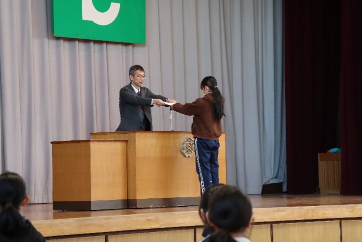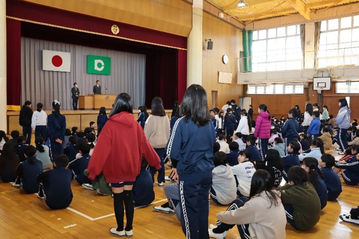朝会では、「書き初め大会」や「町新春ジョギング・駅伝大会」などの表彰伝達が行われました。次に、校長先生から、明日2月3日は節分で、「悪いものを追い出して、健康に過ごすことができるように」と願う日本の伝統的な行事であること、インフルエンザもはやり始めているので、健康に過ごしてほしいことなどについてお話がありました。また、保健主事から、2月は避難訓練月間であり、地震の時のポイントを意識して、安全に避難できるようにしてほしいことなどについて話がありました。そして最後に、執行委員会から今月のめあて「みんなの笑顔のためにがんばれる人になろう」について話がありました。