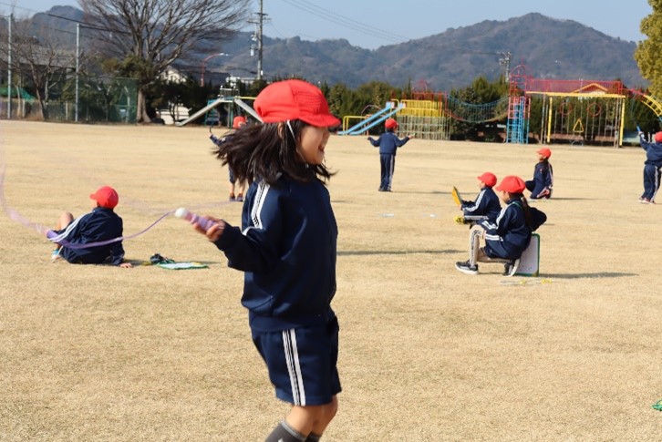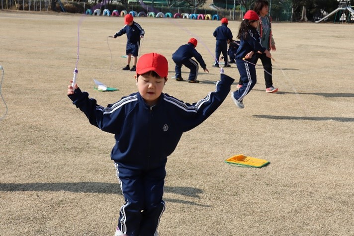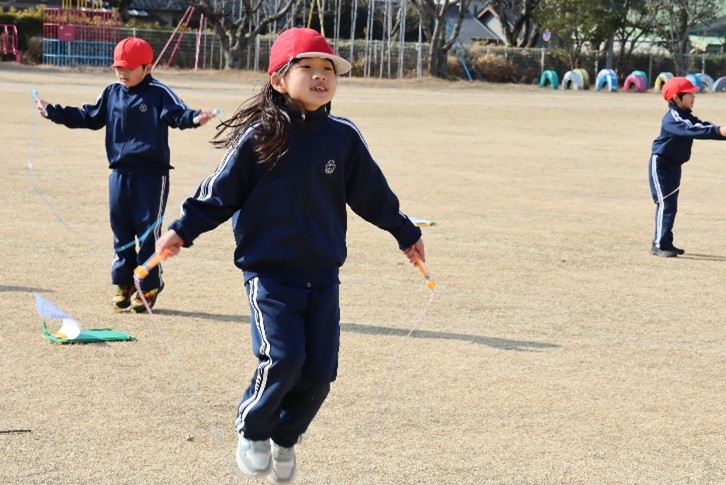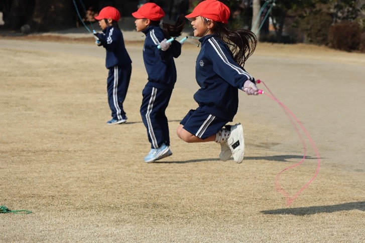1年東組は、体育の授業で「なわとびあそび」の学習を行いました。「前回の自分をこえよう」の課題のもと、友だちと見合いながら、両足跳びや2拍子跳びなど、いろいろな跳び方にチャレンジしました。