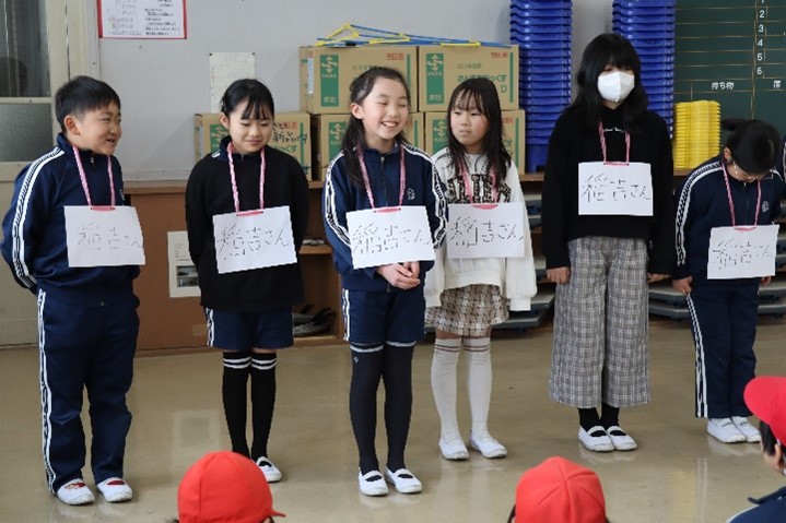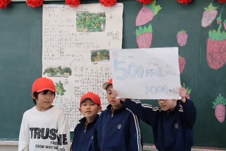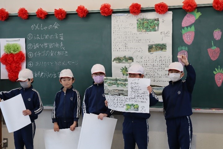 感謝の会では、3年生がイチゴづくりでお世話になった講師の方に、感謝の気持ちを伝えました。イチゴを育てた経験から学んだことや調べて分かったことなどを模造紙や画用紙にまとめ、講師の方に聴いてもらいました。子どもたちの様子から、この会に向けて時間をかけて準備をしてきたことが伝わってきました。講師の方からは、「上手においしいイチゴを育てるのは、答えがなく難しかったと思います。それと同じように、答えが分からない問題に対しても、楽しく学んでいってほしい。」とお話がありました。