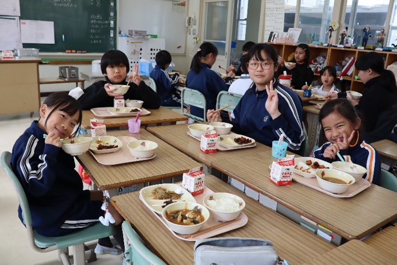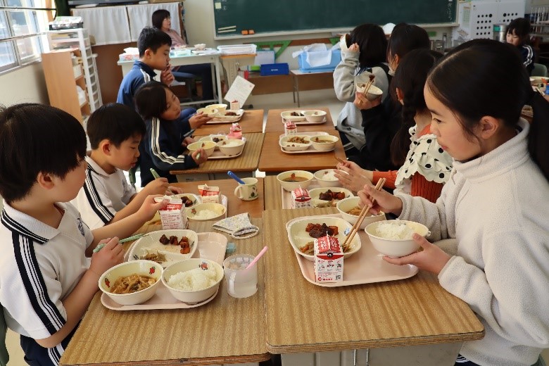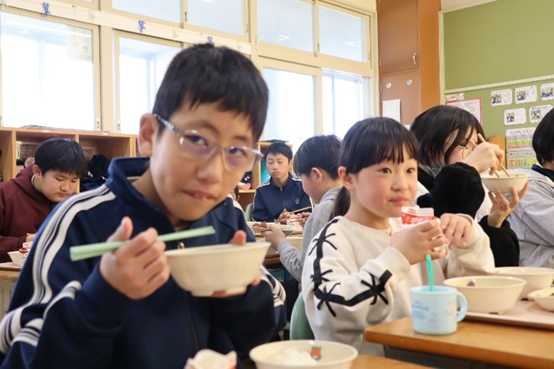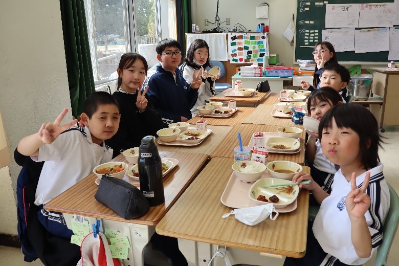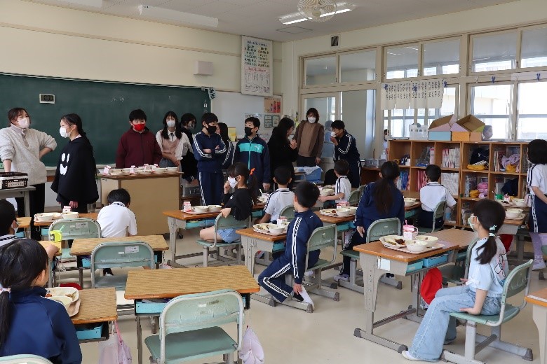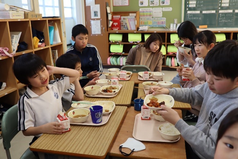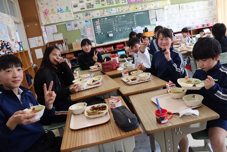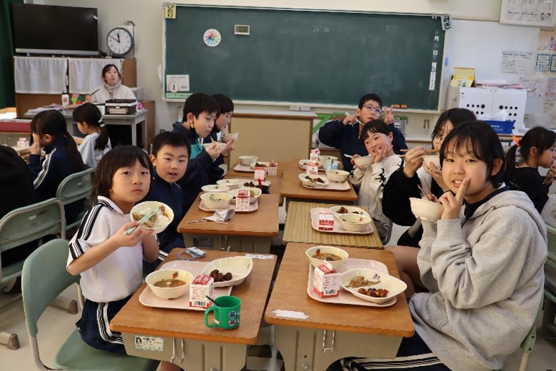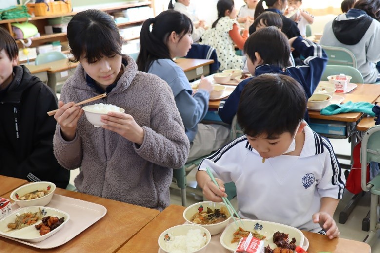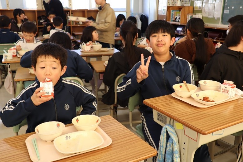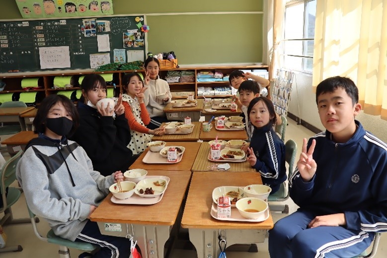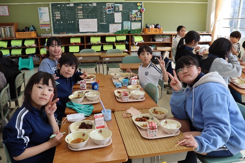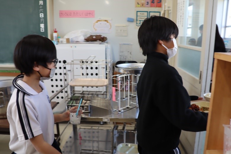 2026年3月16日 16時15分本日、1年生と6年生による給食交流が行われました。6年生が手伝いながら準備をした後、グループに分かれて給食を食べました。学校での出来事や家での過ごし方など、いろいろなことを話しながら楽しく過ごしました。