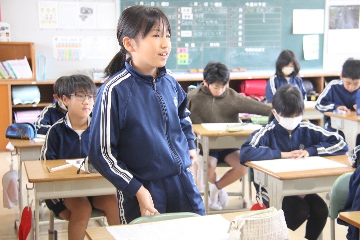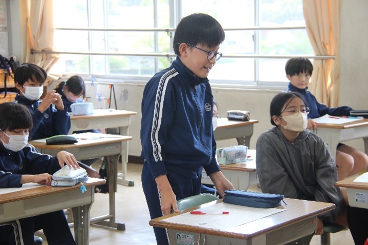5年西組は、国語の「おにぎり石」の授業を行いました。「中心人物の心情がどのように変わっていったのか読み取ろう」という学習課題のもと、出来事や登場人物の行動を確かめながら、中心人物の心情の変化について考えました。そして、「おにぎり石」がどのような存在だったのかを話し合いました。