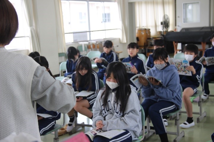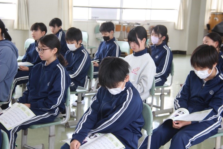 6年東組は、音楽の「おぼろ月夜」の授業を行いました。春の夕暮れのゆったりとした優しい感じを意識しながら、歌いました。また、二部合唱にも取り組み、アルトパートの音程を覚えた後、声が重なり合う響きを感じながら歌いました。
