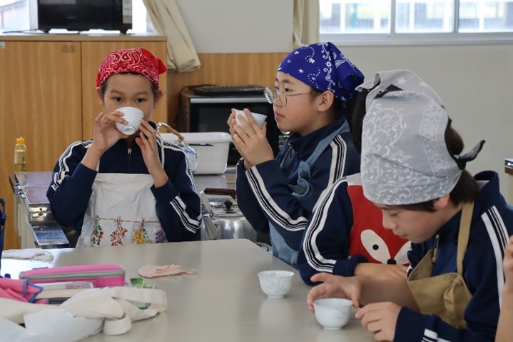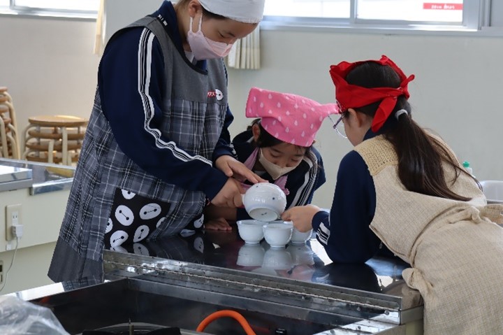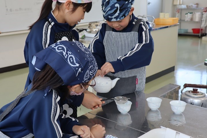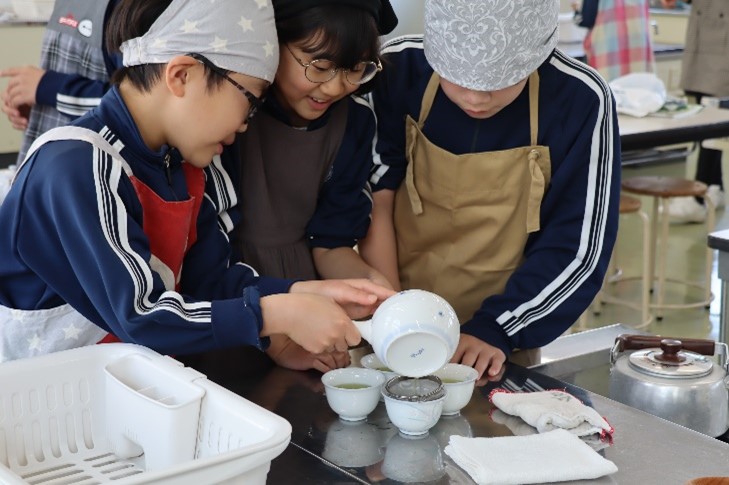 5年東組は、家庭科の「お湯をわかせて、お茶をいれよう」の授業を行いました。5年生になって、初めての調理実習としてお茶の入れ方を学習しました。ガスコンロの使い方を学び、エプロンをして取り組みました。お湯の温度や同じ濃さでつぎ分ける方法を班ごとに確認しながら行いました。
