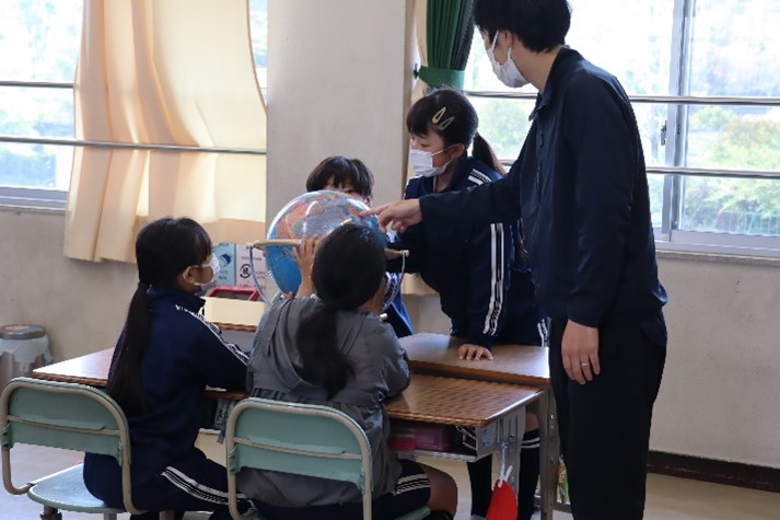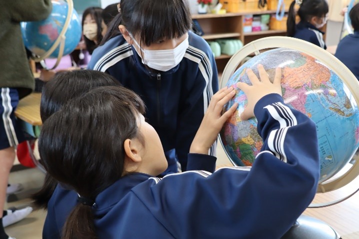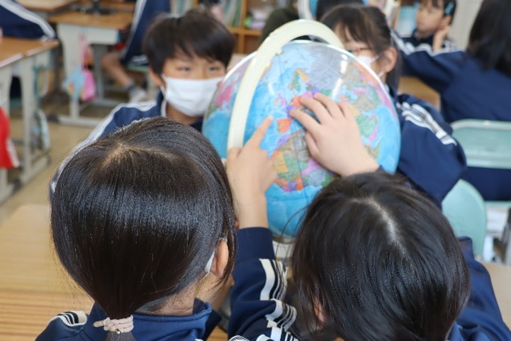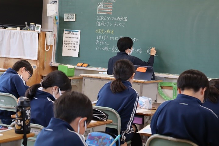 5年西組は、社会の「世界の中の国土」の授業を行いました。世界の国々の首都や国旗について学び、ノートにまとめました。その後、地球儀を使い、緯度や経度について学習し、世界の標準時がイギリスのロンドンにあることを学びました。
